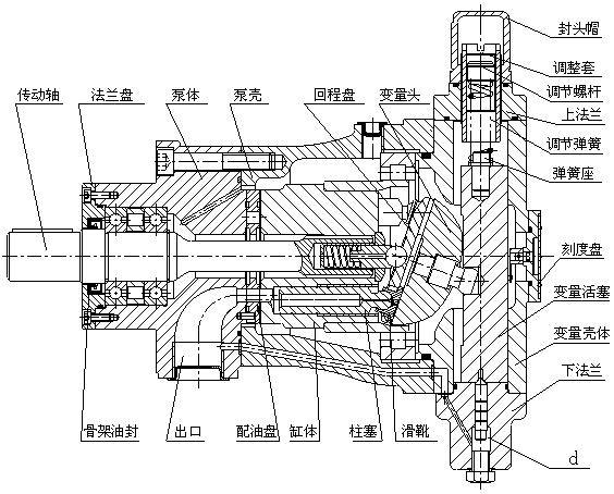 來自主體部分的高壓油,進(jìn)入下法蘭下腔(d),當(dāng)彈簧力大于作用在推桿下端面積上的液壓力時(shí),推動(dòng)變量活塞向下移動(dòng),使泵的流量增加。當(dāng)作用在推桿下端面積上的液壓力大于彈簧的作用力時(shí),變量活塞向上移動(dòng),使泵的流量減少。