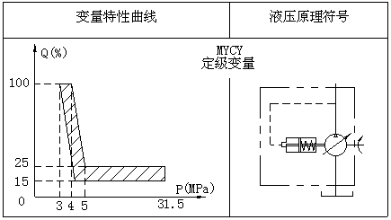 這種泵是依靠內(nèi)控(也可以用外控)油壓操縱變量機(jī)構(gòu)。該泵的壓力調(diào)節(jié)范圍比較小,油壓在3~4Mpa時(shí)產(chǎn)生變量后,流量迅速減小至所要求的高壓流量值。這種泵實(shí)際上相當(dāng)于高低壓組合泵,泵的驅(qū)動(dòng)功率選擇可以參照壓力補(bǔ)償變量泵的功率選擇方法進(jìn)行計(jì)算。
