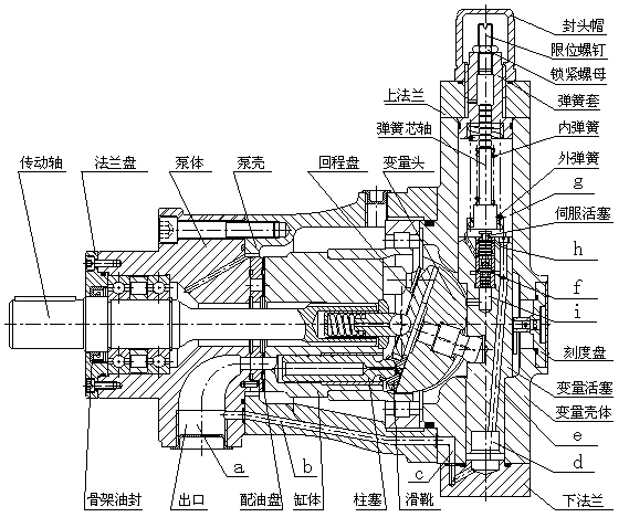 壓力補償變量泵的出口流量隨出口壓力的大小近似地在一定范圍內按恒功率曲線變化。當來自主體部分的高壓油通過通道(a)、(b)、©進入變量殼體下腔(d)后,油液經通道(e)分別進入通道(f)和(h),當彈簧的作用力大于由油道(f)進入伺服活塞下端環形面積上的液壓推力時,則油液經(h)到上腔(g),推動變量活塞向下運動,使泵的流量增加。當作用于伺服活塞下端環形面積上的液壓推力大于彈簧的作用力時,則伺服活塞向上運動,堵塞通道(h),使(g)腔的油通過(i)腔而卸壓,此時,變量活塞上移,變量頭偏角減小,使泵的流量減小。